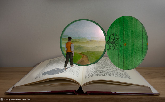 The theme of the month for July over on John Howe’s website is ‘Books‘, which started me thinking about books and what they mean to different people. To me they often open doors to unexpected places, or sometimes to expected places but where you often discover something new 😉 So this is a composite in photoshop of a book opening a doorway into the Shire, with a willing Hobbit ready for a wander 🙂