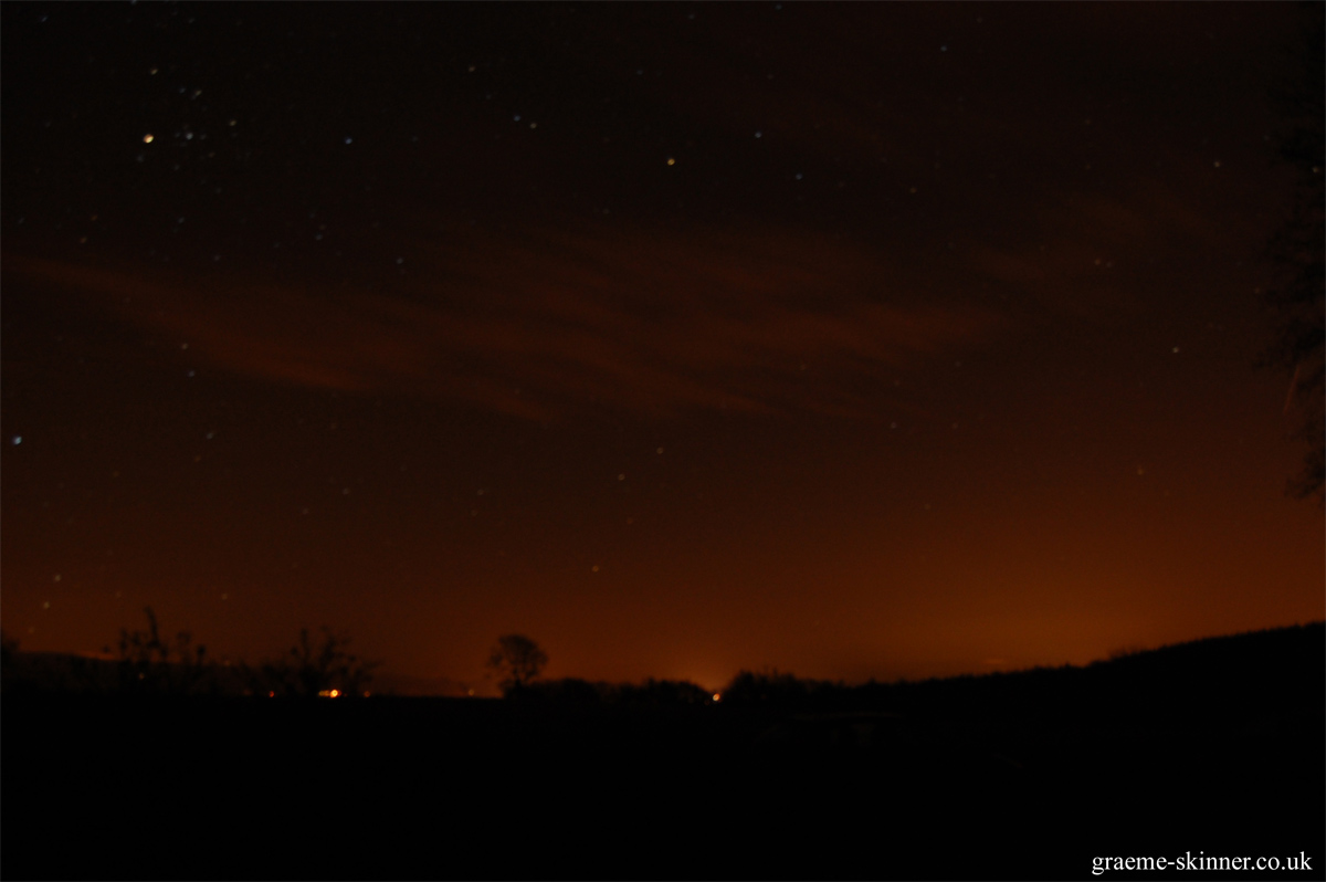 Now you’ll admit, the sky is fairly black behind the stars and pretty much what you’d expect from astrophotography π I then tried to catch Orion as he popped up above the Pennines in the distance, this is when the problems started. I knew that the light pollution in the area was getting unpleasant, I did not know it had become as bad as it had though.