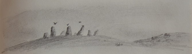 A quick sketch inspired by Duddo Stone Circle, it wasn’t sketched from the actual stones, but when we were walking away I looked back and glimpsed the stones poking up from the hill top and I had a sudden idea for a painting…