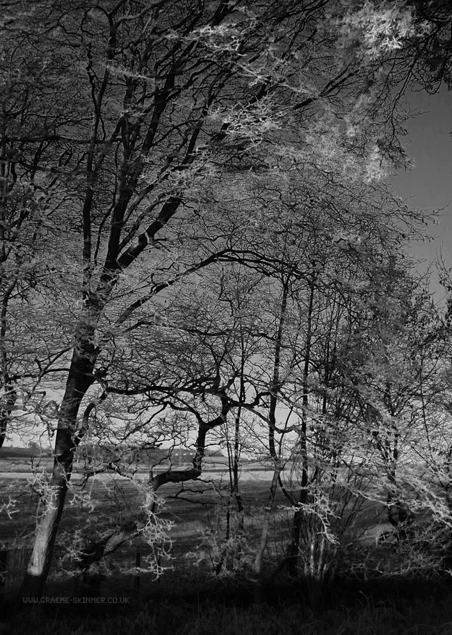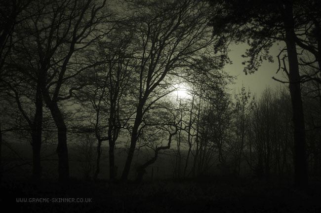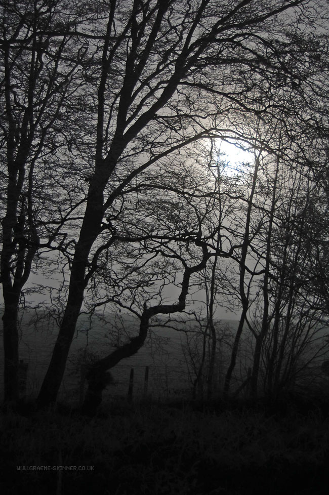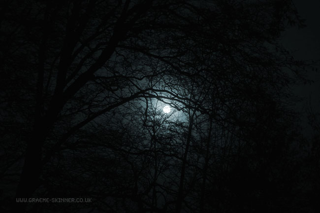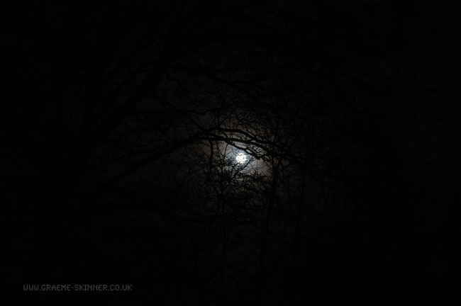When I returned home this morning I was a little disappointed, I had intended having spent a while on the way home stopping off at various places for misty morning photographs. Sadly the weather wasn’t really suitable – being thick fog and black ice on the smaller roads. Next to where I park the car there is a small wooded area, the Moon was just descending towards the horizon and had dipped beneath the tree tops, I stood for a while looking at the way the Moon lit the scene when I decided to try for some ‘darker’ photographs.