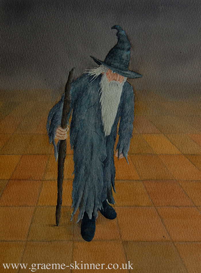So, this is a quick A4 watercolour of Gandalf, his old grey cloak in rags covering his new white garb as he shuffles and stoops his way to the presence of Theoden. Now I really want to paint the full hall, with shafts of light picking out different details, and the other characters in place.