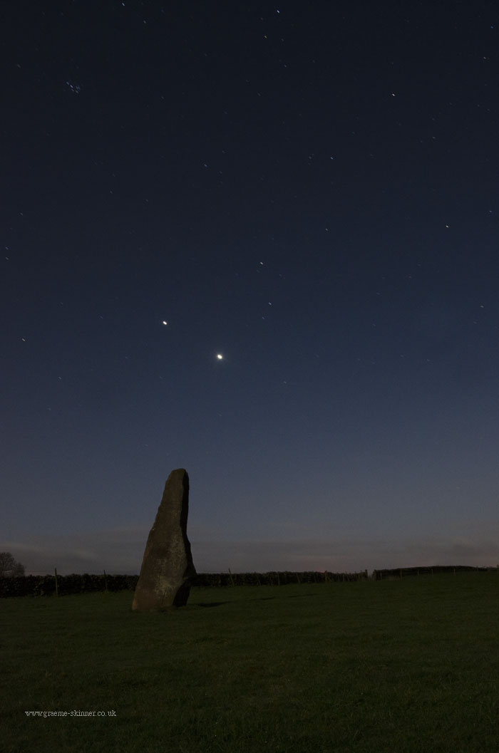 This evening we had a quick run out to Long Meg stone circle, yes, we were just there the other day but Venus & Jupiter were looking good and the Moon was breaking through the cloud. So thick jacket on, we parked up and I wandered about the stones. It’s hard to relate the sense of magic and wonder you feel wandering around a moonlit stone circle with the stars and planets above. To add to the effect the owls started to twit and twoo in the nearby wood πŸ™‚