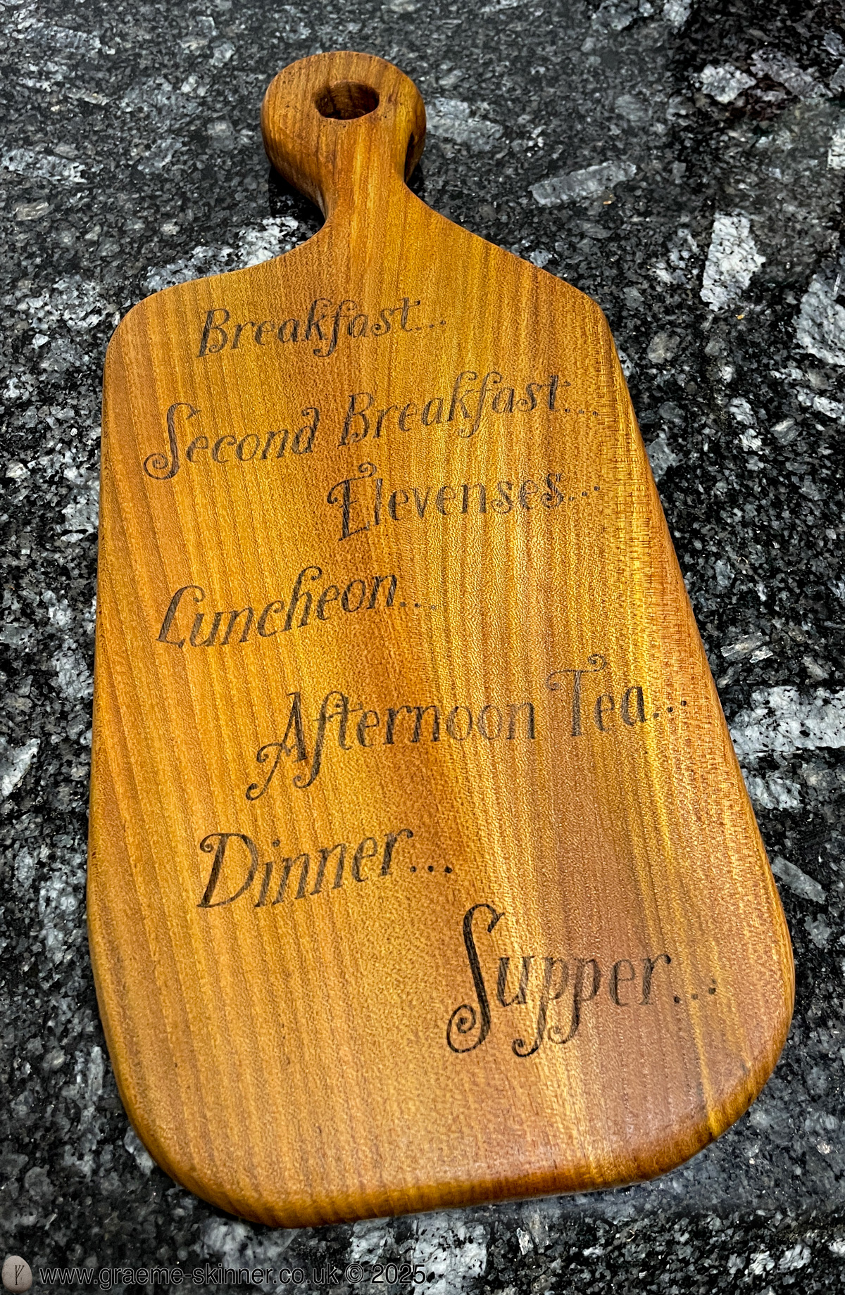 There’s obviously a connection between Hobbits and food, so here’s a Hobbity themed charcuterie board made out of a piece of Elm.